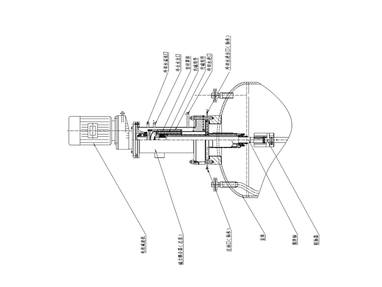 用稀土永磁制作的強磁回轉(zhuǎn)式耦合結(jié)構(gòu)(磁力驅(qū)動裝置),磁力驅(qū)動裝置的基本制造材料均為鐵磁性物質(zhì),磁導率極佳,磁場在穿過用于密封合金層時幾乎沒有損耗。由此外部驅(qū)動永磁體產(chǎn)生的旋轉(zhuǎn)磁場可以有效被內(nèi)部永磁體轉(zhuǎn)子接受,進而帶動反應器內(nèi)的攪拌部件進行物料混合,攪拌速度為0~300r/min,甚至更高,可配推進、槳式、錨式、框式、螺帶等各種槳。